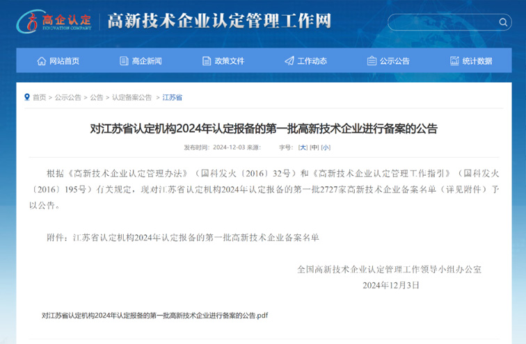 近日,全國高新技術企業認定管理工作領導小組辦公室發布《對江蘇省認定機構2024年認定報備的第一批高新技術企業進行備案的公示》。在這批公示名單中,江蘇大孚集成裝備科技有限公司榮膺在列,光榮上榜。